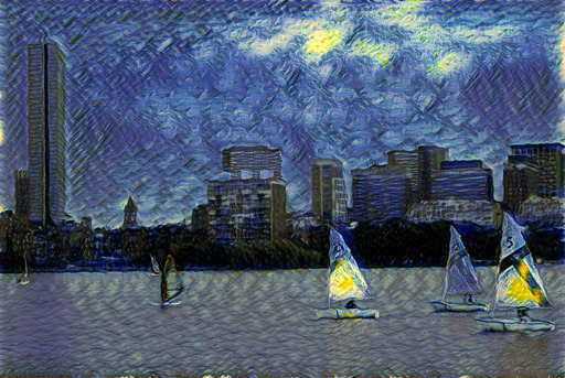 The images at the top of this post were generated with Edvard Munch’s The Scream and a photo I took at the Pittsburgh Zoo in 2017. The images below were generated with Vincent van Gogh’s The Starry Night and a photo I took in Boston in 2015. The image captions indicate the compression rate of the VGG model used for the corresponding style transfer.
